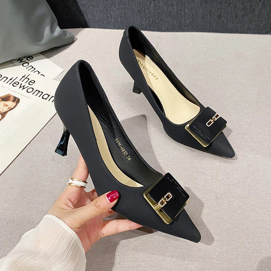2023 Spring Summer New Brand Women Shoes Fashion High Heels Buckle Pointed Toe Shallow Metal Slip on Party Ladies Modern Shoes