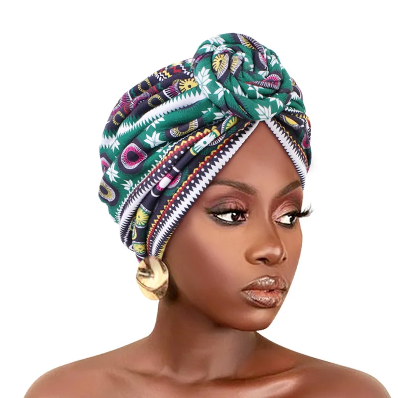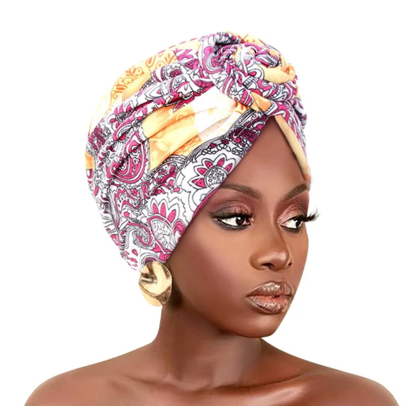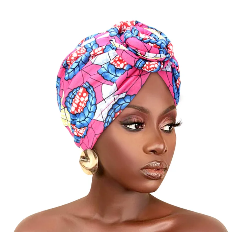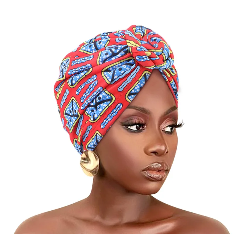 New African Print Pleated Turban Floral Beanie Pre Tied Front Knot Elastic Head Wrap Elegant Women Chemo Cap Bandana Headwear